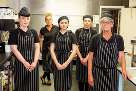 GB. England. Hull. Bus Stop Cafe. Holderness Road. From left to right Beacy McMenis, Danna Matthews, Kendle Duncan-Dave, Abby Hunt & Pamela Tompson. 2017.
