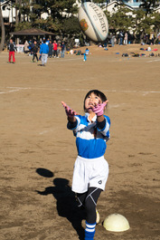 Japan. Tokyo. 2018. Rugby training. Fujisawa Rugby Football Club training on Tsujido public sports park. Young girl catches ball.