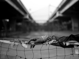 THAILAND. Bangkok. February 10, 2018. Street Sepak Takraw players during a game on a court under an overpass in central Bangkok.