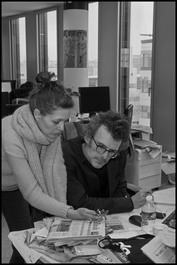 FRANCE. Paris. Liberation newspaper. Feb. 7, 2018. Journalists at work: left Coralie Schaub (journalist), Grégoire Biseau (Assistant Executive Director).