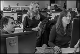 FRANCE. Paris. Liberation newspaper. Feb. 5, 2018. Layout Editors at work: from left Nikola Cindric ( layout editor), Cordelia Bonal and Benedicte Mauduech ( editors)