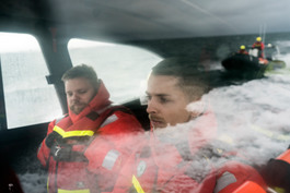 On the coast outside Reykjavik, a squad of coastal rescue workers on excersize on a weekend. Jökull Brjansson, 23, is steering the ship.