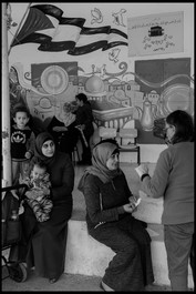 PALESTINE. Tulkarem. 2017. Jewish women medical staff from the PHR (Physicians for Human Rights) NGO offer free medical service to Palestinians, near Tulkarem in Palestine.A nurse takes a blood test in front of a nationalist mural in a girls' school.