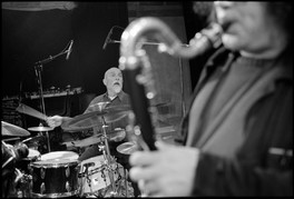 FRANCE. Pays de la Loire region. Sarthe department. Town of Le Mans. "Europa Dzaz" jazz festival (25th edition). Abbaye de l Epau. "Gunter Sommer Swiss Hora Project invite Sylvain Kassap". Rehearsal/soundcheck for the 4:30 PM concert. French Jazz musician Sylvain KASSAP (front, clarinette), German Jazz musician Gunter SOMMER (back, percussions). Sunday May 9th, 2004.