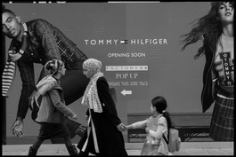 ISRAEL. Jerusalem. 2017. Mamilla shopping center. An Arab and Jewish woman cross in front of an ad.