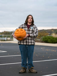 USA. Illinois. Rockford. 'Smashing Pumpkins' annual event. Jed, a student volunteer. 5th November 2017.