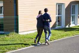 France. Orléans. PEPs. Maison d'Accueil Spécialisée Les Saulniers (Residence for the severely handicapped). A professional helps an autistic resident return to the Monmartre wing. 2017