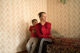 UKRAINE. Zelena Polyana Village, Zone 2, Chernobyl Region. 2017. Displaced people Kachalina Elena (44) and grandson Arthur (4) relocated from Hirske in the Luhansk conflict zone of eastern Ukraine seeking cheaper rent. Kachalina moved with her daughter Chudakova Irina (24), her son Krasov Misha (14) and grandson Arthur Chudokov.