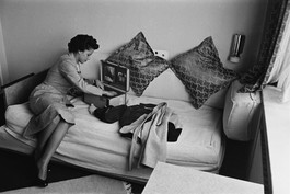 GB. England. London. 1953. Corra Lahorra, air stewardess for Philippines Air, travels the world. Resting in a London apartment.