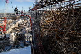 FRANCE. Paris, the 18th of february 2020. Notre-Dame of Paris' cathedral after fire. Techinicians are posing the last tubes on the burnt scarfolfing in order to reinforce it before dismantle it.
