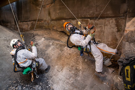 FRANCE. PARIS. 26 June 2019. A rope access technician cleaning the site where the Arrow was standing.
