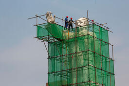 CHINA. Chengdu. 2019. The statue of Mao Zedong undergoes maintenance in Tianfu Square.
