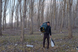 Turkey, Edirne. 2020. Ahmet Selmet carries a small boat near Turkish Greek border, he will attempt to cross by boat through Maritsa river in Edirne. His famliy fled from Aleppo duirng the war and took refuge in Germany. He said ‘I’m going to join them, I cant live without my famliy’.