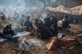 Turkey, Edirne. 2020. Migrants wait in buffer zone between Turkish...