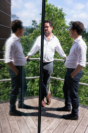 UK. England. London. Magnum annual meeting. President Thomas Dworzak speaking with Michael Arnold (Eve Arnold's grandson) and Michael Arnold (Eve Arnold's grandson). 2019