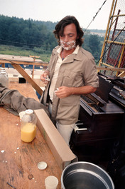 USA. Bethel, NY. 1969. John Morris, announcer and stage manager, on the second day of Woodstock Festival.