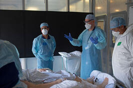 UK. 2020 . London. West Middlesex University Hospital. Intensive Care Unit where 80% of the patients have COVID-19. Morning ward round with Head of ITU Dr Tim Peters. 15 of the 30 ICU bed are filled.