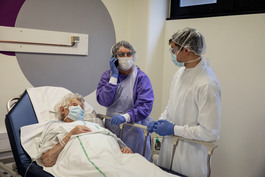 An elderly lady with the virus is helped by a nurse to speak to her daughter on the telephone. The lady refuses to stay in the hospital, she prefers to return home, convinced that the internment in the hospital will worsen her situation.