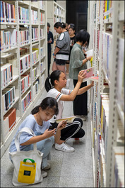 China. Guangdong. Shenzhen. Students select books from the stacks for reading in the library of the Shenzhen Library Complex and one student checks both her phones. 2019