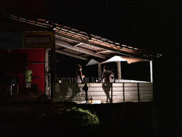 BRAZIL. ITACARÉ. April 11, 2020. A group of friends meet at the bar on a Saturday night during the COVID-19 quarantine. All bars and restaurants are closed in Itacaré but the isolation is specially hard due to the small housing and the high temperatures. Near the port a bar usually full of fishermen is now dark and closed, but some people still meet there, bringing their beers and fighting the tedious hours of the weekend with some conversation.