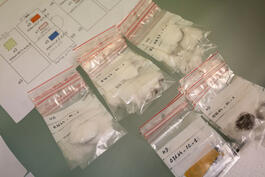 FRANCE. CHAMPS SUR MARNE. 08th of october 2019. LRMH ( Laboratory of Research of Historical Monuments ). Research on several elements coming fron the burning of Notre-Dame cathedral. Claudine Loisel, chemist, ingeneer of research, supervisor of the stained glass window pole. She is currently observing and taking samples from a piece of a stained glass window which contains lead originally and maybe from the burning. This piece comes from the glass located in the heart of the cathedral (Baie 212, baie haute du chevet). It represents David, Abraham and two angels holding jewish phylacteries. Detail of David's coat.