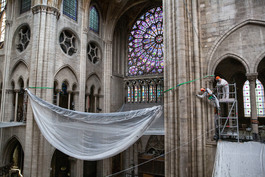 FRANCE. Paris. 11 July 2019. Rope access technicians prepare a net that will be placed across the Cathedral's transepts to cushion any falling debris.