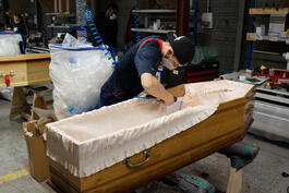 FRANCE. Chevilly Larue, 07 april 2020. Society SAPI, belonging to "Artisans du Funéraire" where 15 people work to prepare the coffins before being delivered to the place where the person died. During this time of COVID-19, they double the number of coffins per day: from usually around 75 per day to 150 since mid march.