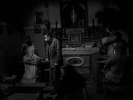 ITALY. Sicily. April 4, 2020. Mr. Enzo Ciancio checking his paper mache maquette in a church. It is strictly forbidden for anyone to travel except if for necessary supplies.