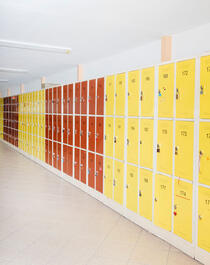 Student's lockers at the high school closed due to COVID-19 pandemic. Public schools were one of the very first institutions to face coronavirus lockdown.