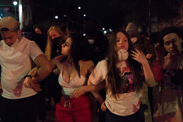 USA. Minneapolis, Minnesota. May 31, 2020. People listen and pray after an older community member calls for solidarity in an impassioned speech following a series of scuffles amongst those guarding and keeping vigil at the site of the killing of George Floyd.