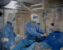 Russia. Moscow. April 27, 2020. Hospital 52nd. Radiologist- Chirurg Stanislav Korzunov installs cannulas for veno-venous ECMO on a patient with mechanical ventilation with severe pneumonia