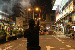 CHINA. Hong Kong. October 1, 2019 is China's 70th National Day. Most of the "pro-China celebrations" in Hong Kong have been low-key and indoors. Out on the streets are the protests in six districts on Hong Kong Island and in Kowloon. Tens of thousands protesters dressed in black march on the street voice their "Five Big Demands," police answer with rounds and rounds of tear gas and over a hundred of protesters are arrests by midnight.
