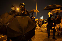 CHINA. Hong Kong. September 28, 2019 is the 5th year anniversary of Umbrella Revolution, protesters confront the riot police guarding the People's Liberation Army complex and shooting water canon to the protesters.