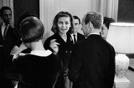 USA. NYC. 1963. Lauren Bacall speaking with hairdresser Kenneth Battelle.