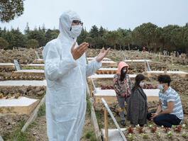 Turkey, Istanbul. May 21, 2020.An Imam (left) prays during a funeral ceremony in Kilyos cemetery coronavirus site.
