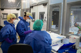 UK. 2020. London. West Middlesex University Hospital at the peak of the coronavirus pandemic. ITU where doctors watch over a patient on a ventilator.