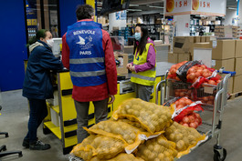 FRANCE. Paris, 02 april 2020. Coronavirus crisis. Some volonteers from the NGO Secours Populaire in the 18th district are collecting food over the expiry date to distribute it to poor poeple. here at "Metro" which provides goods for professionals. The volonteers bought additionnaly missing oignons and potatoes.