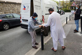 FRANCE. Paris, 02 april 2020. Coronavirus crisis. A volonteer of NGO Secours Populaire in the 18th district is distributing food to poor poeple around and in the North suburbs. Here in the 19th district, rue Manin.
