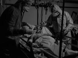 ITALY. Catania, Sicily. March 25, 2020. In the intensive care unit of Cannizzaro Hospital in Catania, Sicily, a man with coronavirus is kept breathing with the help of a ventilator