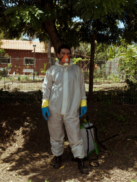 BRAZIL. Itacaré. March 31, 2020. Despite the denial of president Bolsonaro, the cities and states of Brazil are creating their own protocols and rules to prevent and fight the COVID-19 pandemic. In Itacaré, a small town in the South of Bahía, the Mayor has employed street vendors who are now stopped because of the isolation, to fumigate all the neighbourhoods of the city.
