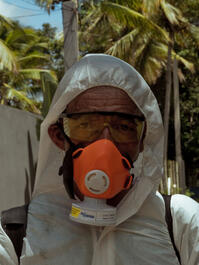 BRAZIL. Itacaré. March 31, 2020. Despite the denial of president Bolsonaro, the cities and states of Brazil are creating their own protocols and rules to prevent and fight the COVID-19 pandemic. In Itacaré, a small town in the South of Bahía, the Mayor has employed street vendors who are now stopped because of the isolation, to fumigate all the neighbourhoods of the city.