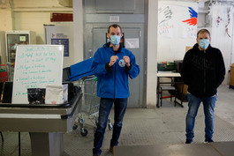 FRANCE. Paris, 02 april 2020. Coronavirus crisis. NGO Secours Populaire in the 18th district. martin, person in charge of this place and teams is explaning the planning of the day and teaching the security gestures and rules to follow regarding the virus.