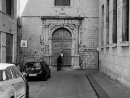 ITALY. Siracusa. March 15, 2020. Homeless in front of a closed church. All religious functions have been suspended.