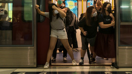 CHINA. Hong Kong SAR. Protesters lock the entrance of Yuen Long MRT station, shoot laser beams to provoke the riot police. Despite some damages to the MRT facilities, no injuries and no clashes between the protesters and police and protesters. The protest to condemn the Yuen Long incident on July 21 during which time protesters were beaten by the triad, thugs and police, ends peacefully and return home via MRT.