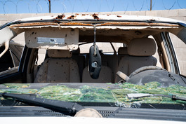 MEXICO. Caborca, Sonora. 2019. Bullet-ridden car caught in Sinaloa cartel shoot-out.