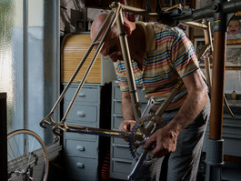 ITALY. Milan. 2016. Alberto Masi building a bicycle inside his workshop, located in the same building as Velodromo Vigorelli.