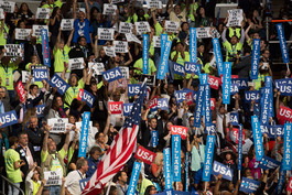 USA. Philadelphia, PA. 2016. Bernie Sanders delegates listen to Presidential nominee Hillary Rodham Clinton's speech to the DNC.