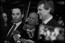 FRANCE. Paris. Jan. 27, 2017. Benoit HAMON (winner to the second round) and Arnaud MONTEBOURG (loser), candidates to the Primaries of the Left visit Pepiniere 27, a building dedicated to start ups.