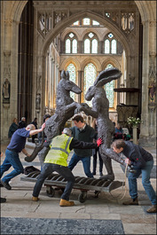 England. Wiltshire. Salisbury. Salisbury Cathedral. Artist Sophie Ryder's sculpture of a lurcher and a Lady Hare being wheeled on a trolley into position in the cathedral.
