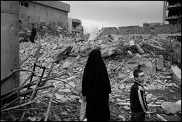 TURKEY Cizre. March 3, 2016. A woman and a child stand amid the rubble of a building in the Cudi district of Cizre, destroyed during Turkish Army operations against Kurdish militants.